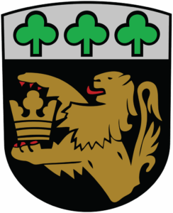 Unter silbernem Schildhaupt, darin nebeneinander drei grüne Kleeblätter, in Schwarz ein wachsender, rot bewehrter goldener Löwe, der mit seinen Vorderpranken eine goldene Krone hält.